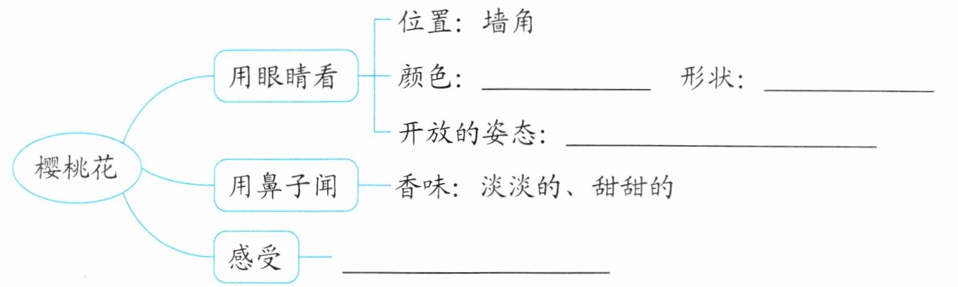 2. 第②自然段中,作者是如何观察樱桃花的?借助思维导图梳理观察所得。