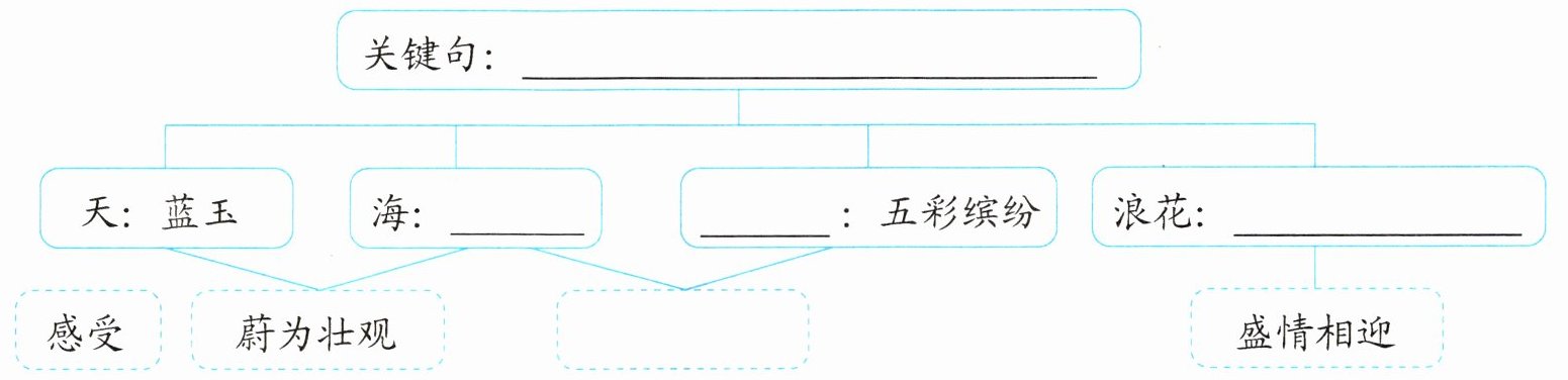 1. 难以计数 数不胜数 用之不竭 南沙是祖国巨大的蓝色宝库 2. 南沙也是一个迷人的世界。 翡翠 海产 挥舞着的花束 心旷神怡 3. C 解析:本题考查内容理解。第③自然段采用的是先总后分的方式,先总写南沙是祖国巨大的蓝色宝库,再分写南沙群岛丰富的资源,所以C选项错误。 4. 比喻 欢迎人群 挥舞着的花束 洁白的浪花迎面向我扑来的画面 5. 示例:南海明珠欢迎八方来客!