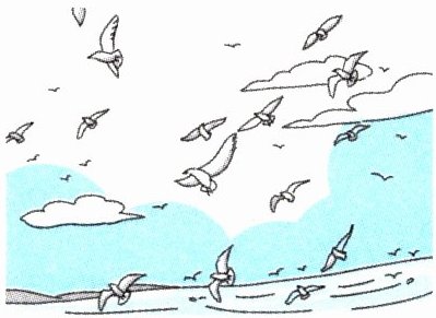 示例:在空中盘旋着,好似在交流 贴着海面低飞,瞅准时机捕鱼 忙着飞到岸边,把捕到的鱼赶紧吃到肚子里