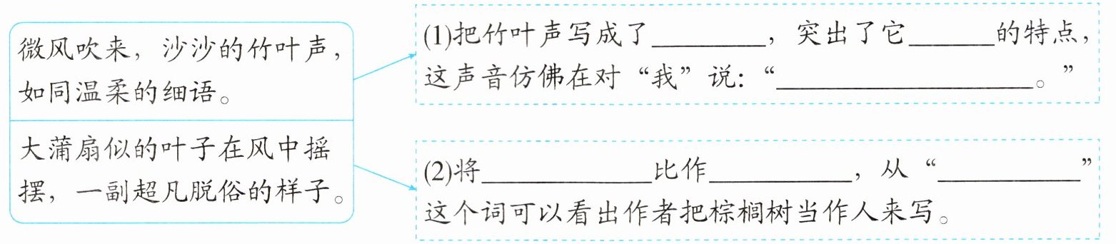 (2)棕榈树的叶子 大蒲扇 超凡脱俗 4. 示例:小鱼儿一会游到倒影处,似乎看不到鱼儿的影子,一会又游出倒影,立马显露出来,仿佛在捉迷藏。