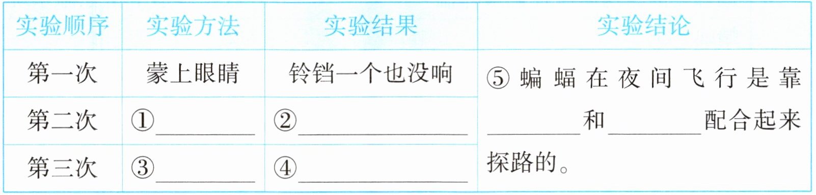 |第一次|蒙上眼睛|铃铛一个也没响|⑤ 蝙蝠在夜间飞行是靠______和______配合起来探路的。|