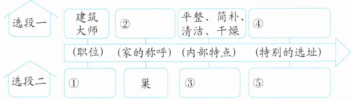 选段二:①、巢(家的称呼)、③(内部特点)、⑤(特别的选址)