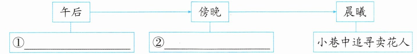 1. 几分安逸 几分宁静 2. ①漫步西街观榕树 ②江边看孩子嬉戏 3. 大树绿荫如盖,无数根须低垂着,仿佛大树的血液,它们重新回到大地深处,与泥土紧紧相连。 大树的枝丫上蹲着几只黑色的小鸟,叽叽喳喳地说个不停,或歌唱或低语。 静态描写突出榕树的古老和稳固,动态描写则表现生机和活力。 4. “仿佛挑着一担春天”传达出作者对卖花女子所挑担中鲜花所代表的春天的生机与美好的惊喜和喜爱之情,表现出作者对阳朔春天美景的陶醉。 解析:画横线句子中,作者将卖花女子担子里的花形容为“一担春天”,生动地传达出作者对卖花女子所挑担中鲜花的喜爱,这些鲜花代表着春天的生机与美好。同时,结合全文作者对阳朔的山水、人们的生活等的描写,可以体会到作者对阳朔春天美景的陶醉之情,以及对这种充满生机与美好的生活环境的喜爱和赞美。