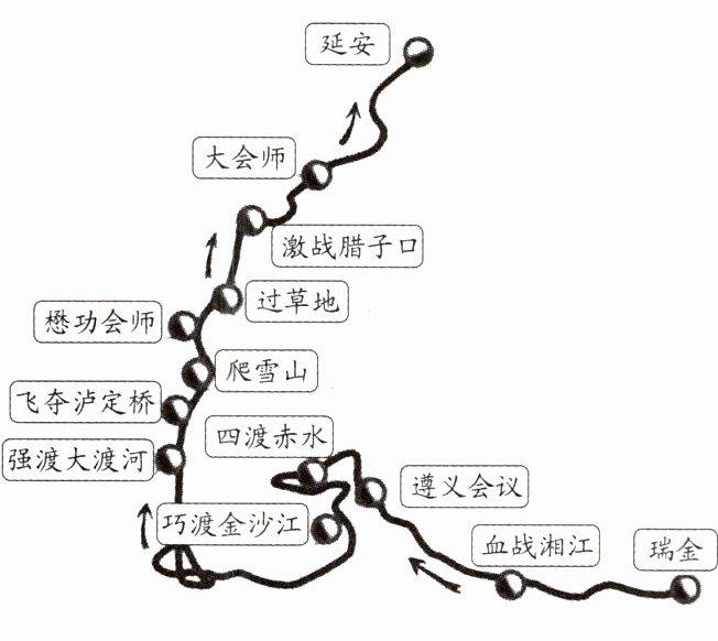 1. 大会师 巧渡金沙江 强渡大渡河 爬雪山 解析:《七律·长征》最后一句“三军过后尽开颜”中的“三军”指的是三军会师,因此是大会师时期之前的事情。《七律·长征》中,“金沙水拍云崖暖,大渡桥横铁索寒。更喜岷山千里雪,三军过后尽开颜”分别提及了巧渡金沙江、强渡大渡河、爬雪山等事件。据此在长征路线图中的相应位置圈出这些事件。