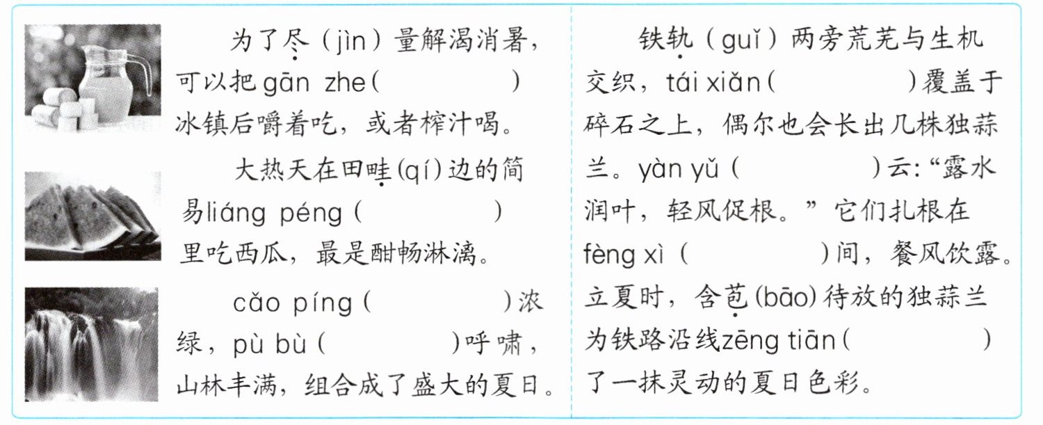 为了尽(jìn)量解渴消暑,可以把 gān zhe( )冰镇后嚼着吃,或者榨汁喝。