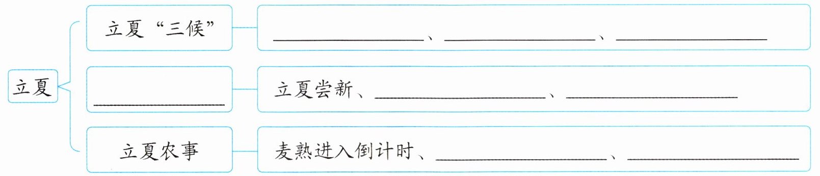 1. 新思维 逻辑梳理 选文围绕立夏这一节气,从不同的方面进行了介绍。阅读文章,把下面的思维导图补充完整。