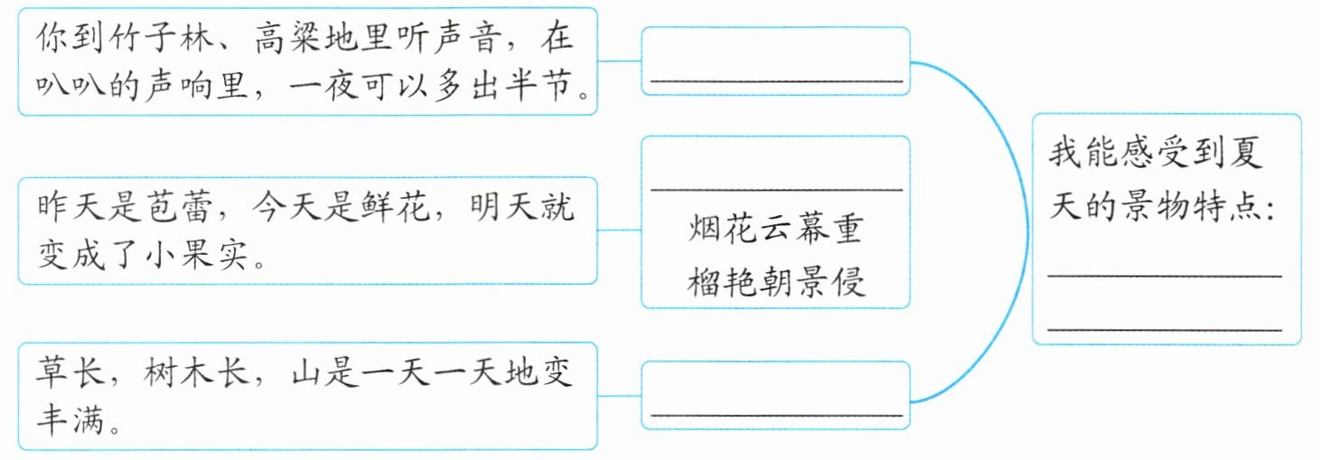 2. 新思维 逻辑梳理 诗歌围绕夏天展开,选取了多种景物进行描写。木木发现诗歌里有许多景物,在课文《夏天里的成长》出现过。他决定借助课文来加深理解,请你帮他完成下面的思维导图。