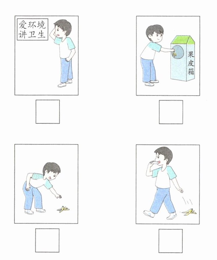 提示:4幅题图分别是小朋友看到了“爱环境,讲卫生”的标语,小朋友将香蕉皮扔进果皮箱,小朋友捡起香蕉皮,小朋友随手乱扔香蕉皮。因此正确的顺序应该是小朋友先随手乱扔香蕉皮,走在路上看到了标语,然后回去捡起香蕉皮,再将香蕉皮扔进果皮箱,所以答案是2、4、3、1。
