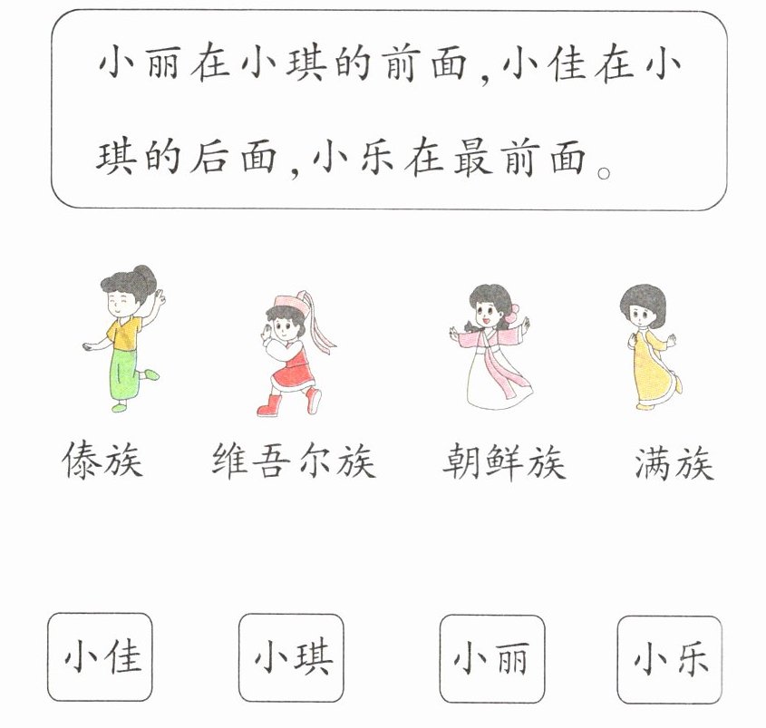 提示:根据题目中的描述,小丽在小琪的前面,小佳在小琪的后面,则小丽、小琪和小佳从前到后的顺序为小丽、小琪、小佳,又因为小乐在最前面,所以四个小朋友从前到后的顺序为小乐、小丽、小琪、小佳。据此连线即可。