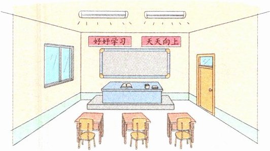 窗户在教室的(左 右)面墙上,门在教室的(左 右)面墙上,教室的(前 后)面墙上有两条横幅,(上 下)面还有两盏灯。