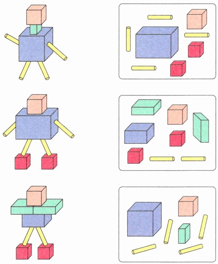 1. 一(1)班举行“机器人”大赛,小朋友们创作出了不同的作品。下面的机器人是用哪组积木搭成的?连一连。