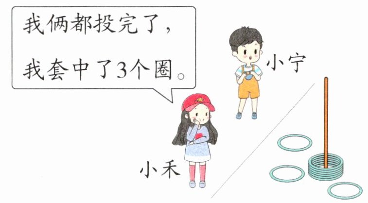 (1)数一数,杆上一共有6个圈,小禾套中了3个圈,所以小宁套中了6 - 3 = 3(个)圈。