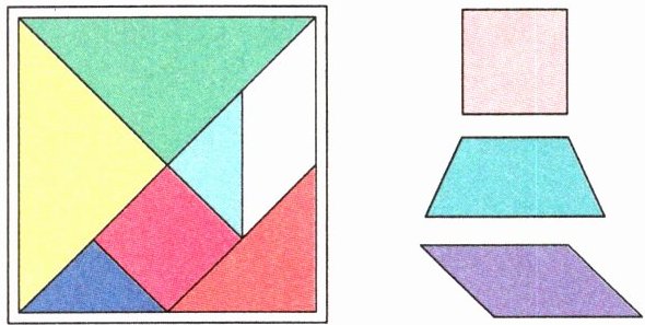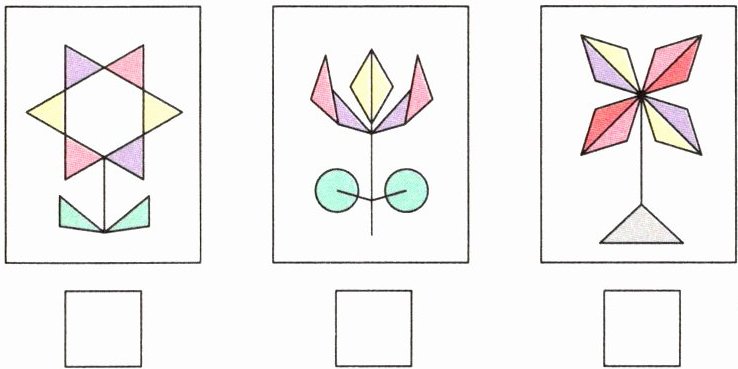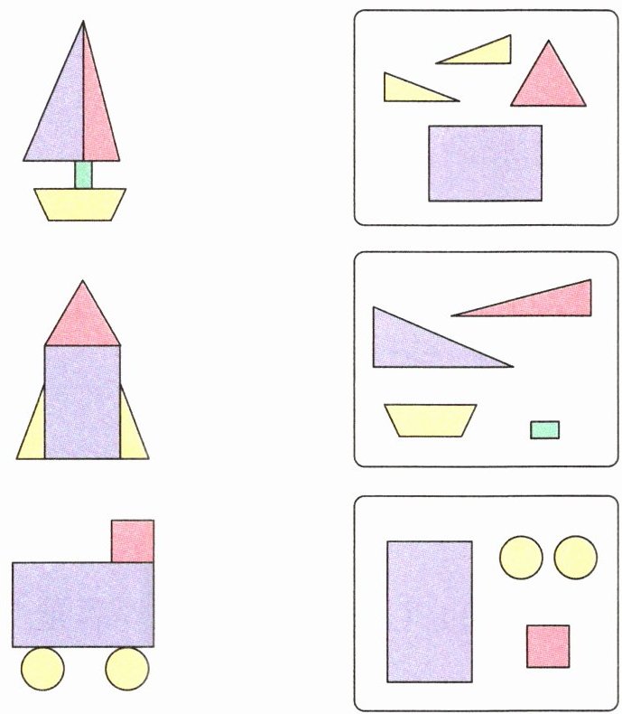 1. 下面的图形分别是用哪组彩纸拼成的?连一连。