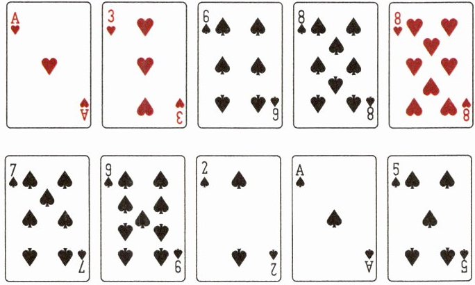 (1)从上面的牌(A表示1)中选出三张相加等于10。