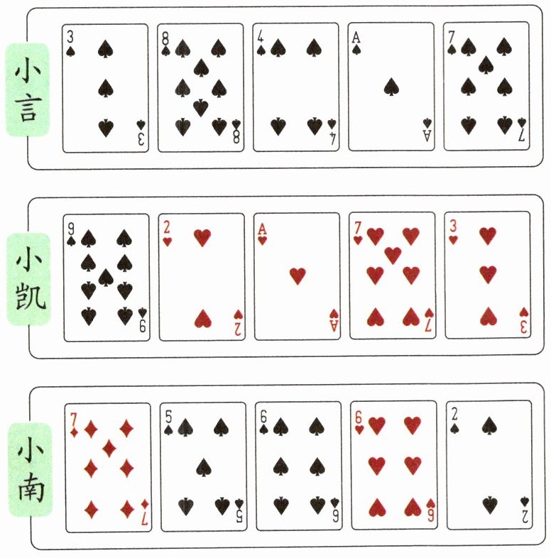 小言、小凯、小南依次出牌,每人按从左到右的顺序轮流出一张牌。如果谁出牌后,能用加法或减法算出三张牌上的数的结果是10,出牌人拿走这三张牌。各出完五张牌即结束。