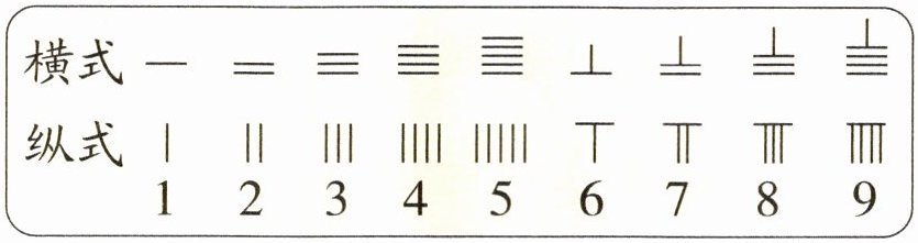 )。因此可以总结算筹表示数的规律:有2种不同的基础算筹,然后通过两种算筹互相之间(