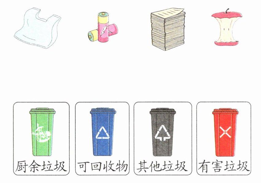 4. 新素养 应用意识 周六小明去扔垃圾,请你帮小明分分类,连一连。