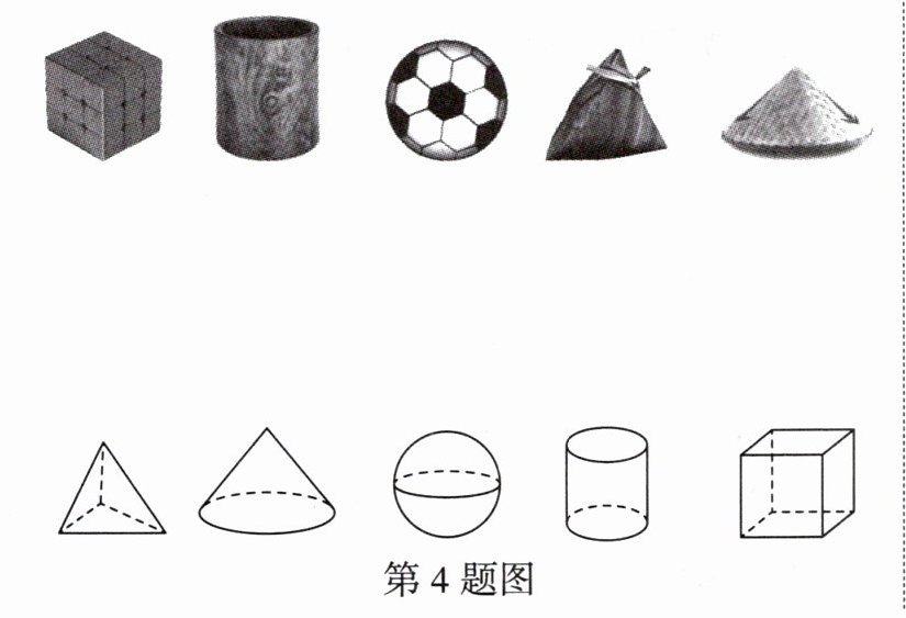 4. (教材素材改编)请将下图中第一行的物体和其对应的立体图形连接起来.