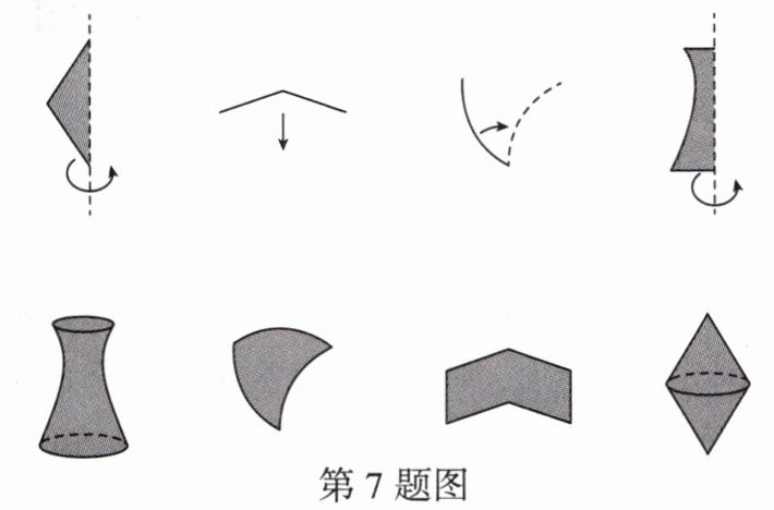7.(教材复习题第10题改编)如图,请将第一行图形按箭头所示方向平移或绕定点旋转或绕虚线旋转后形成的平面图形或立体图形与第二行对应的平面图形或立体图形连起来.