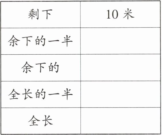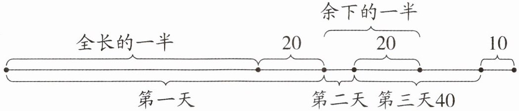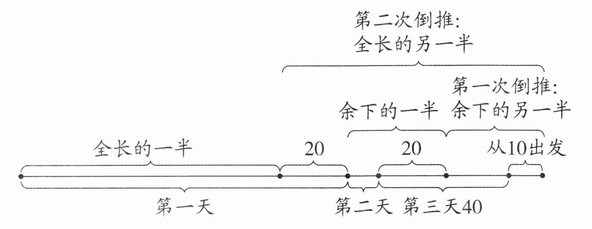 我们可以根据线段图理清数量关系,从剩下的10米出发,第一次倒推第一天修后余下的一半,第二次倒推小路全长的一半,如下图(单位:米)。