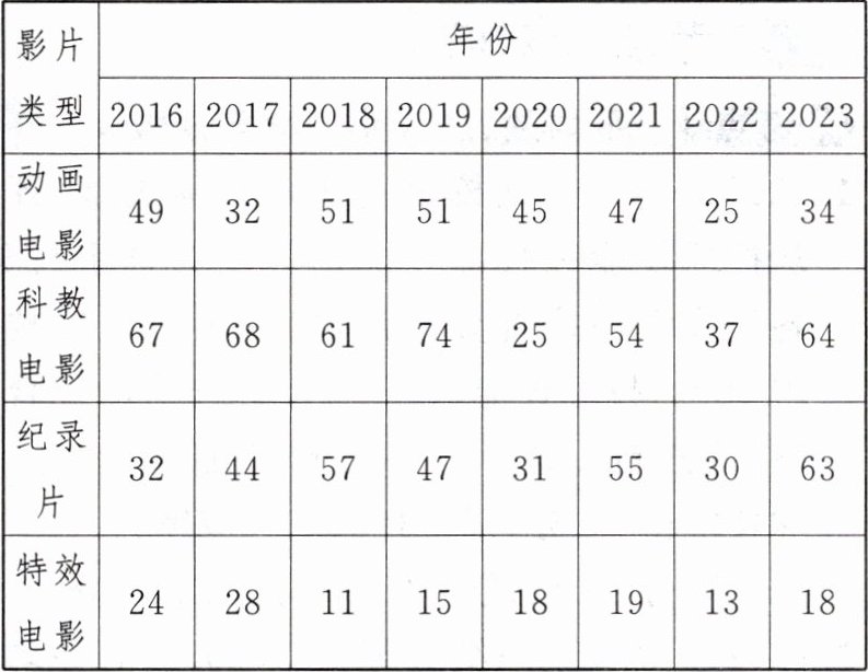 4. 下表统计了2016年至2023年四种类型电影的生产量.