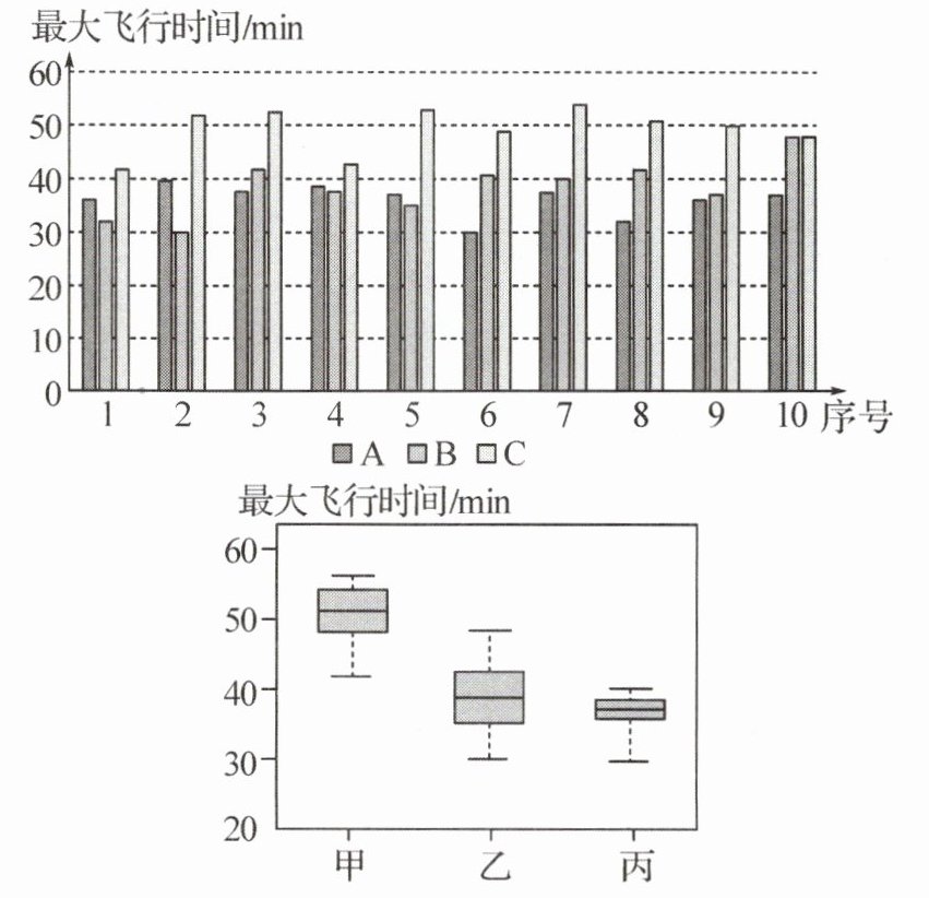 9. 小红为了解 A,B,C 三款品质相近的无人机在一次充满电后运行的最长时间,分别随机调查了 A,B,C 三款无人机各 10 架,记录它们运行的最长时间(单位:min),并对数据进行整理,绘制了两张统计图,但是在绘制统计图时小红不小心弄混了箱线图分别对应哪款无人机,请分辨出乙无人机对应