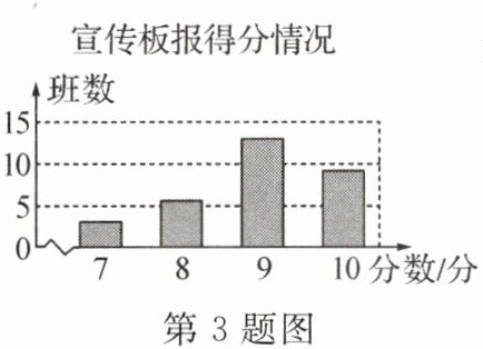 3. (2024·河南)2024 年 3 月是第 8 个全国近视防控宣传教育月,其主题是“有效减少近视发生,共同守护光明未来”.某校组织各班围绕这个主题开展板报宣传活动,并对各班的宣传板报进行评分(满分 10 分),得分情况如图所示,则得分的众数为