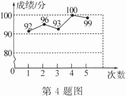4. (2024·淄博)数学兴趣小组成员小刚对自己的学习质量进行了测试.如图,这是他最近五次测试成绩(满分为 100 分)的折线统计图,那么其平均数和方差分别是(