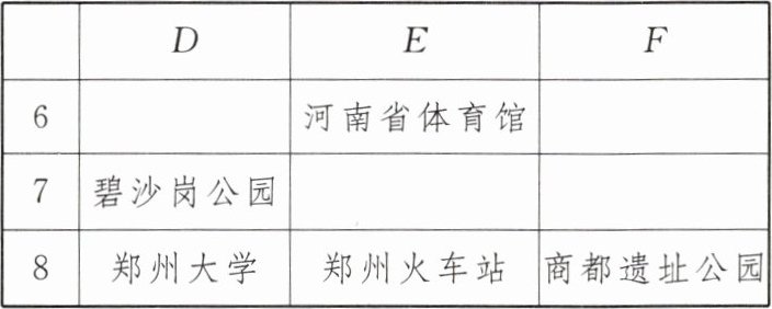 4. (教材 P56 随堂练习 T1 变式)下表是郑州市地图简图的一部分,表中“河南省体育馆”所在的区域表示为$E6$,则“商都遗址公园”所在的区域表示为