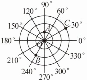 7. 杭州外国语校本经典题(2024·甘孜州)如图,在一个平面区域内,一台雷达探测器测得在点$A,B,C$处有目标出现.按某种规则,点$A,B$的位置可以分别表示为$(1,90^{\circ}),(2,240^{\circ})$,则点$C$的位置可以表示为
