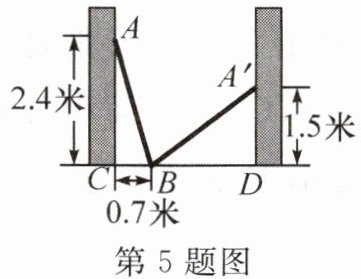 5. 如图,小巷左右两侧是竖直的墙,一架梯子斜靠在左墙时,梯子底端到左墙角的距离 BC 为 0.7 米,梯子顶端到地面的距离 AC 为 2.4 米。若保持梯子底端位置不动,将梯子斜靠在右墙时,梯子顶端到地面的距离 A'D 为 1.5 米,则小巷的宽为(