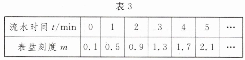 通过对学思小组数据的分析,为让时间“看得见”,善思小组改进了实验装置,如图2,可以将水的体积直接转化为仪表盘的刻度,小组同学记录了仪表表盘刻度m与流水时间t的数据如表3.