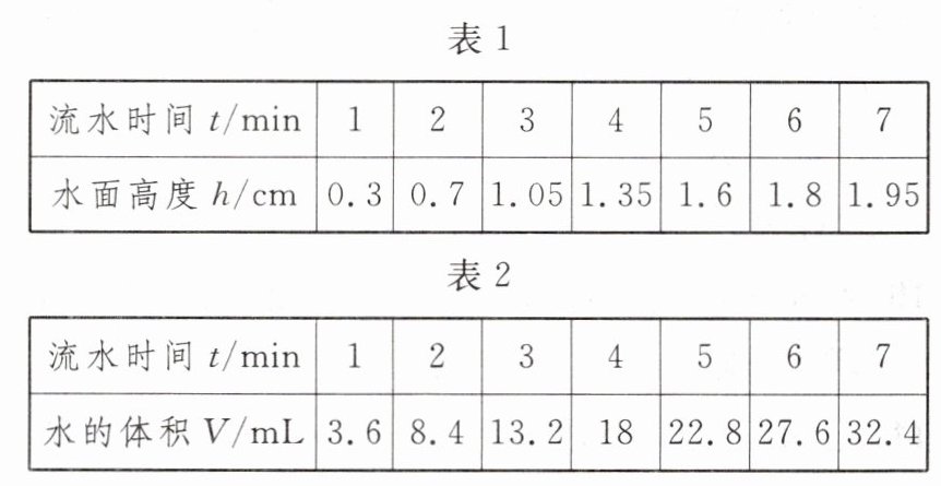 图1是学思小组制作的计时仪器,水流分别经过纸杯1,2,3最后流入纸杯4,记录了流入纸杯4的水面高度h(cm)与流水时间t(min)的关系如表1,同时又记录了水的体积V(mL)与流水时间t(min)的关系如表2.