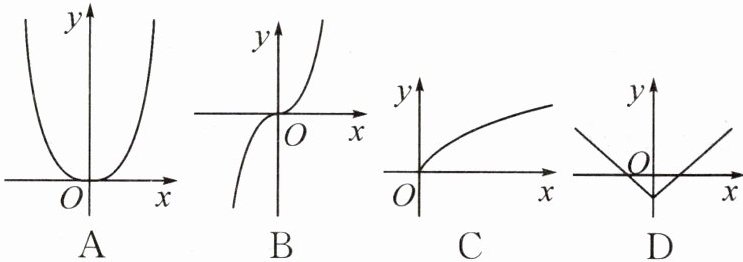 14. 我们知道,通过列表、描点、连线可以画出一个函数的图象. 在画完函数$y = 2x$的图象后,何老师给同学们提出一个问题:“不通过画图,你能解释为什么函数$y = 2x$的图象经过第一、三象限吗?”聪明的小亮经过思考,给出了这样的解答:“当$x > 0$时,$y = 2x > 0$,此时描出的点都在第一象限;当$x < 0$时,$y = 2x < 0$,此时描出的点都在第三象限. 所以函数$y = 2x$的图象一定经过第一、三象限.”大家不禁为善于思考的小亮鼓掌. 最后何老师又给大家留了一道思考题:下面四个图象中哪个是函数$y=\sqrt{x}$的图象(