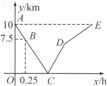 10. 小蕾家与外婆家相距270 km,她假期去看望外婆,返回时,恰好有一辆顺风车可以带小蕾到A服务区,于是,小蕾与爸爸约定,她先搭乘顺风车到A服务区,爸爸驾车到A服务区接小蕾回家.两人在A服务区见面后,休息了一会儿,然后小蕾乘坐爸爸的车以60 km/h的速度返回家中.在小蕾的整个行程中,小蕾与自己家的距离y(km)和时间x(h)之间的关系如图所示.