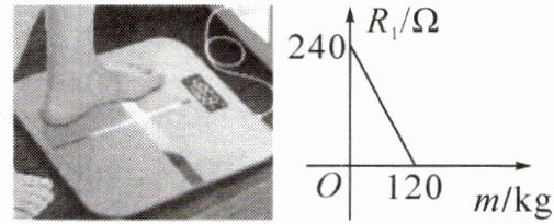 9. 新考向 跨学科 电子体重秤原理是利用力传感器在置物平台上放上重物后,使表面发生形变而引发了内置电阻的形状变化,电阻的形变必然引发电阻值的变化,电阻值的变化又使内部电流发生变化产生了相应的电信号,电信号经过处理后就成了可视数字.简易电子秤制作方法:制作一个装有踏板(踏板质量忽略不计)的可变电阻R₁,已知R₁与踏板上人的质量m之间的关系式为R₁ = km + b(其中k,b为常数,0 ≤ m ≤ 120),如图所示.下列说法不正确的是(