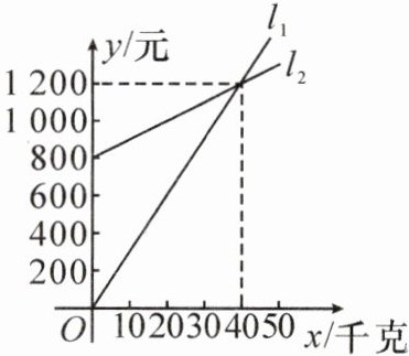 (1)设$y_1 = k_1x$.根据题意,得$40k_1 = 1200$,解得$k_1 = 30$. $\therefore y_1 = 30x(x \geq 0)$.设$y_2 = k_2x + b$.根据题意,得$800 = b$,①$1200 = 40k_2 + b$.②将①代入②,得$k_2 = 10$.$\therefore y_2 = 10x + 800(x \geq 0)$.