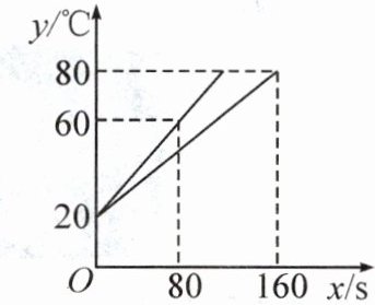 (2)设乙壶中水温$y$关于加热时间$x$的关系式为$y = kx + b$.根据题意,得$20 = b$,①$80 = 160k + b$.② 将①代入②,得$k = \frac {3} {8}$. 乙壶中水温$y$关于加热时间$x$的关系式为$y = \frac {3} {8}x + 20$.