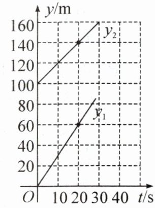 (2)将点(20,60)代入$y_1 = k_1t$,得$k_1 = 3$.根据题意,得$100 = b$,①$140 = 20k_2 + b$.② 将①代入②,得$k_2 = 2$.$k_2$的实际意义是小亮的速度是2m/s.