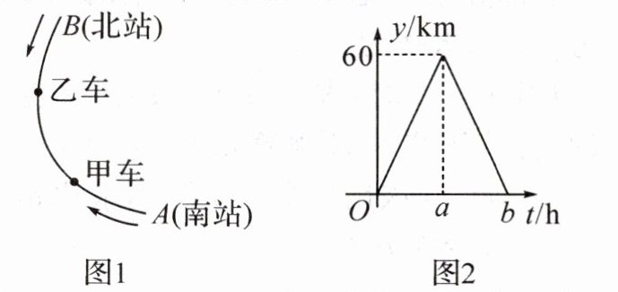 8. 如图$1$,长为$60km$的某段线路$AB$上有甲、乙两车,分别从南站$A$和北站$B$同时出发相向而行,达到$B$,$A$后立马返回到出发站停止,速度均为$30km/h$,设甲车、乙车距南站$A$的路程分别为$y_{甲}$,$y_{乙}(km)$,行驶时间为$t(h)(t\geq0)$.