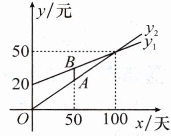(2)当$x = 50$时,$y_1 = 0.3×50 + 20 = 35$,$y_2 = 0.5×50 = 25$.$\therefore AB = y_1 - y_2 = 10$.$AB$的实际意义是当借阅50天时,两种方案每本书的借用租金相差10元.