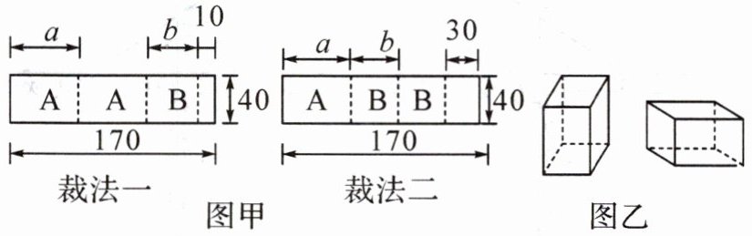 7. 我市某包装生产企业承接了一批上海世博会的礼品盒制作业务,为了确保质量,该企业进行试生产.他们购得规格是 170 cm×40 cm 的标准板材作为原材料,每张标准板材再按照裁法一或裁法二裁下 A 型与 B 型两种板材(如图甲,单位:cm).