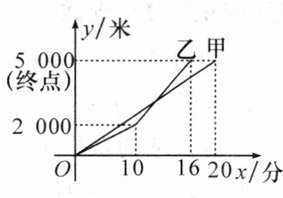 (2)设甲跑的路程$y$(米)与时间$x$(分)之间的关系式为$y = ax$,则$20a = 5000$,解得$a = 250.\therefore$甲的函数表达式为$y = 250x(0 \leq x \leq 20)$。