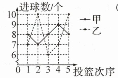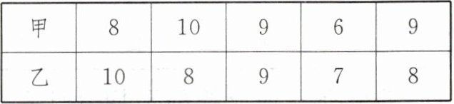 $5.(1)8 (2)\bar{x}_{甲}=\frac{1}{5} × (8+10+9+6+9)=8.4,s_{甲}^{2}=\frac{1}{5} × [(8-8.4)^{2}+(10-8.4)^{2}+(9-8.4)^{2}+(6-8.4)^{2}+(9-8.4)^{2}]=1.84.\bar{x}_{乙}=\frac{1}{5} × (10+8+9+7+8)=8.4,s_{乙}^{2}=\frac{1}{5} × [(10-8.4)^{2}+(8-8.4)^{2}+(9-8.4)^{2}+(7-8.4)^{2}+(8-8.4)^{2}]=1.04.\because s_{甲}^{2}>s_{乙}^{2},\therefore $乙队的成绩更稳定.