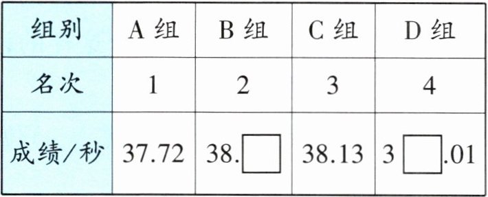 6. 下面是四组同学“两人三足”比赛的成绩及名次,在方框中填入合适的数字。