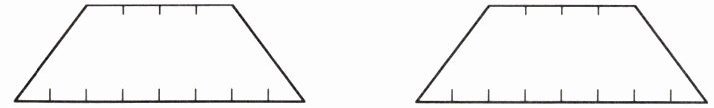 提示:要划分的梯形的上、下底之和是12厘米,可以在刻度线的上、下进行连接,保证划分后的梯形的高是相等的。计算面积之间的倍数,也就转化成上、下底之和间的倍数。面积相等:甲梯形和乙梯形的上、下底之和均为6厘米;面积是2倍关系:甲梯形的上、下底之和是8厘米,乙梯形的上、下底之和是4厘米;面积是3倍关系:甲梯形的上、下底之和是9厘米,乙梯形的上、下底之和是3厘米,画出的梯形符合该数据即可。