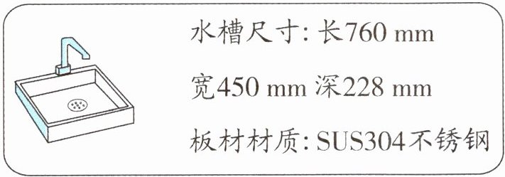 水槽尺寸:长760 mm 宽450 mm 深228 mm 板材材质:SUS304不锈钢