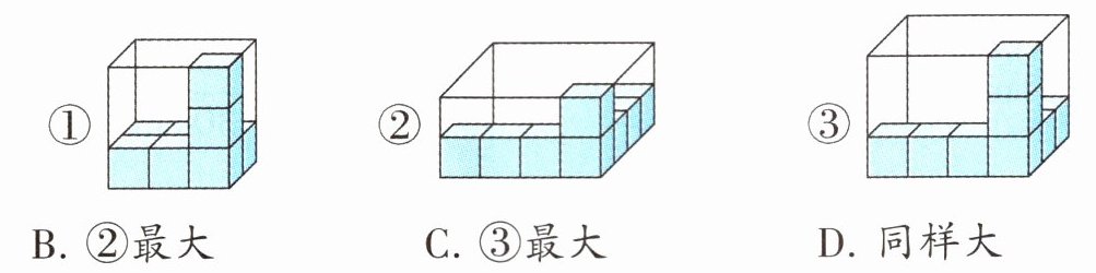 C 提示:观察题图可知,第①个盒子,长包含 3 个小正方体,宽包含 2 个小正方体,高包含 3 个小正方体,体积是 3×2×3=18(立方厘米);第②个盒子,长包含 4个小长方体,宽包含 4 个小正方体,高包含 2 个小正方体,体积是 4×4×2=32(立方厘米);第③个盒子,长包含 4 个小正方体,宽包含 3 个小正方体,高包含 3 个小正方体,体积是 4×3×3=36(立方厘米),36>32>18,所以③最大,此题的正确选项是 C。