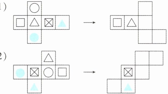 5. 新素养 空间观念 请根据左侧展开图的各个面的图形,在右侧相同正方体的不同展开图的各个面上画出相应的图形。