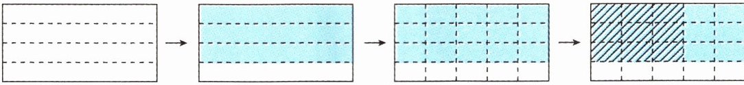 $\frac{3}{4}×\frac{3}{5}=\frac{9}{20}$ 提示:观察题图可知,把单位“1”平均分成4份,取其中的3份,用分数表示就是$\frac{3}{4}$,再把$\frac{3}{4}$看作单位“1”,把单位“1”平均分成5份,取其中的3份,用分数表示是$\frac{3}{5}$,也就是求$\frac{3}{4}$的$\frac{3}{5}$是多少,列式为$\frac{3}{4}×\frac{3}{5}=\frac{9}{20}$,即她研究的乘法算式是$\frac{3}{4}×\frac{3}{5}=\frac{9}{20}$。